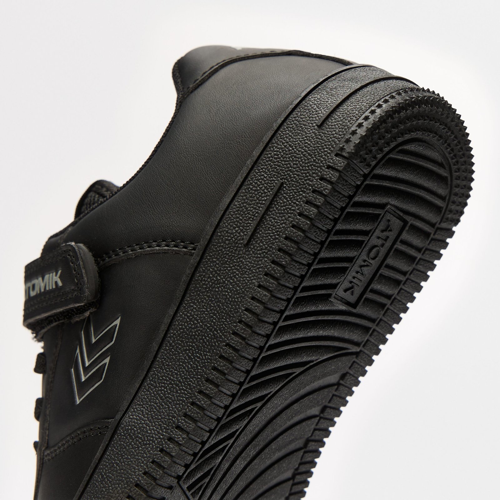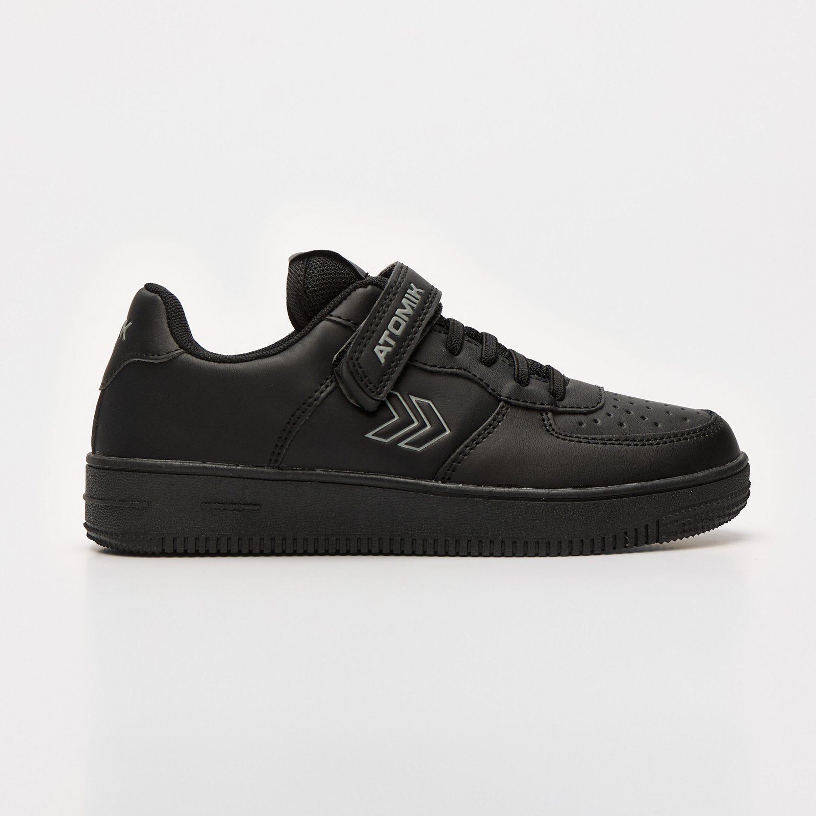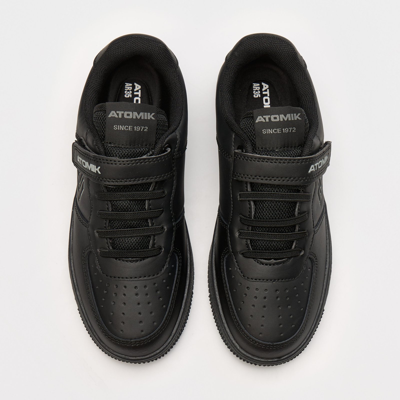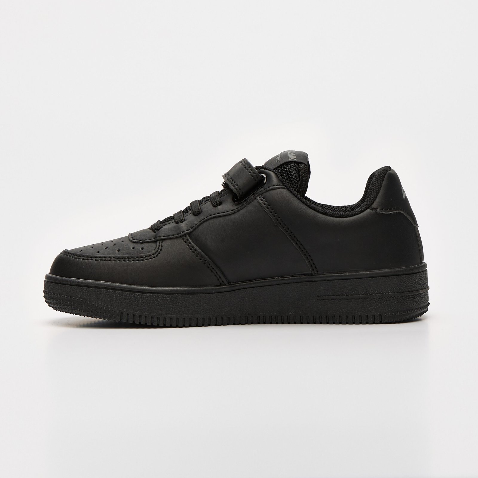 Zapatilla deportiva colegial con tira de abrojo y cordones elásticos. Capellada de sintético símil cuero con puntera reforzada en cuero.